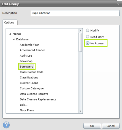 Menus : The settings under the menu tab generally show the areas that you can access by clicking the drop down menus at the top of Management. For instance, under Menu / Database, you will find Borrowers. This setting corresponds to the table of the same name. Should you wish to prevent access to the Borrowers table, first you must select it and then choose the appropriate level of access on the right hand side.