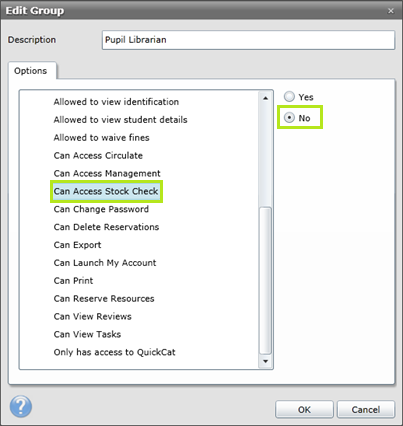 For example, to prevent anyone in the group from access Stock Check, click the setting Can Access Stock Check and select No on the right menu.
