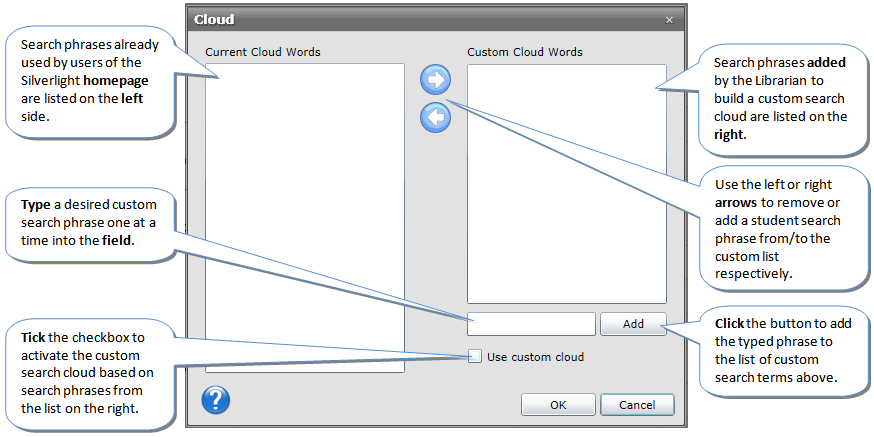 A window will open displaying the phrases students have searched for on the left. To add student phrases to a preferred list of search terms on the right, use the right arrow button (the left arrow button reverses this process for a selected search term on the right).