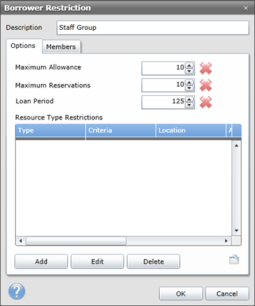 Similarly to Resource Type Restrictions, you can set up restriction groups for your borrowers which allows you to have different restrictions per Tutor Group or individual. Tweaking the settings of the restriction group is useful when you wish to adjust the amount of resources a particular borrower (or Tutor Group) can have out at any one time. This also allows you to add an extra layer of control over how your resources are issued. For example, you could create a borrower restriction group to only allow resources within a certain location to be issued to the nominated tutor groups/borrowers.