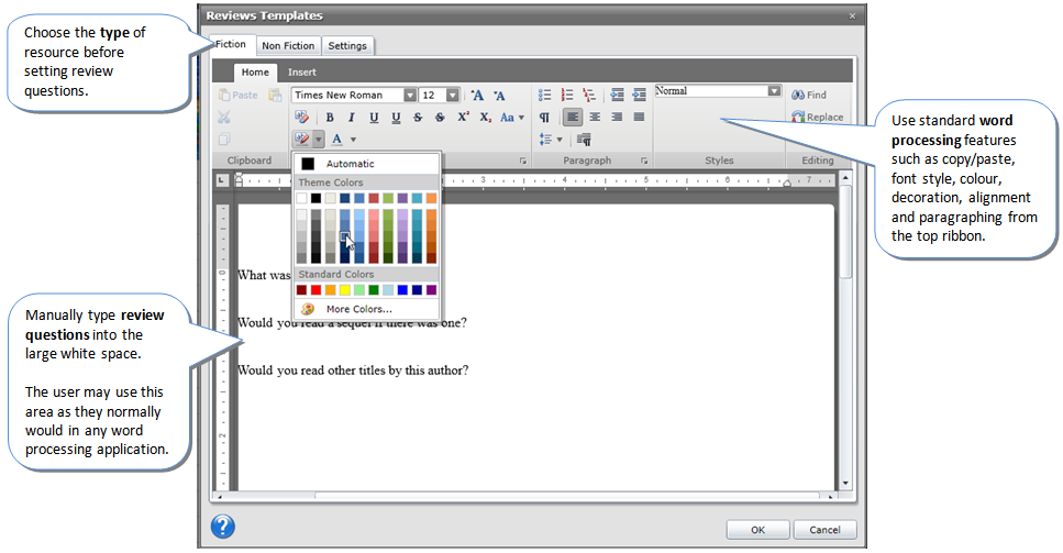 Type the questions for the borrowers to answer in the large white space, ensuring these are written for both Fiction and Non Fiction items (if needed).