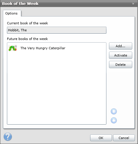 This topic demonstrates how to nominate books as future books of the week. Once a book is nominated as a future Book of the Week, over the coming weeks the library application will automatically update the Book of the Week for you. In addition to nominating books, it may be desirable to immediately force an item as the Book of the Week to try and raise interest in the book. This topic does not discuss how to do this but for instructions see the topic Forcing a New Book of the Week.