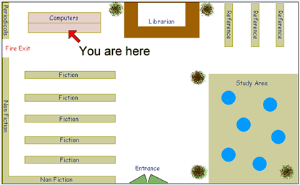 A floor plan is diagram/map of the library which is used to help borrowers locate resources in the library. The picture below shows an example of a floor plan: