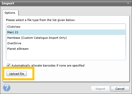 When purchasing batches of resources, many suppliers offer a barcoding service where the barcodes already contain a label before being delivered. Often, a digital MARC file is provided with these books that can be imported straight into the Catalogue, negating the need to add them one by one. Should you have a MARC file that does not contain barcodes within the accompanying file, you can either import this into the Catalogue and let the system automatically generate a barcode or import it into the Custom Catalogue.