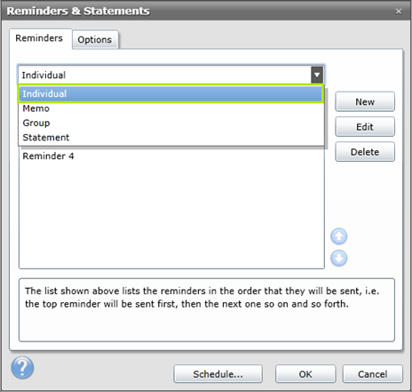 ·Select a Reminder from the list and click Edit to amend an existing one. If creating a new one, simply click New instead. In this example, an existing Reminder is being edited.