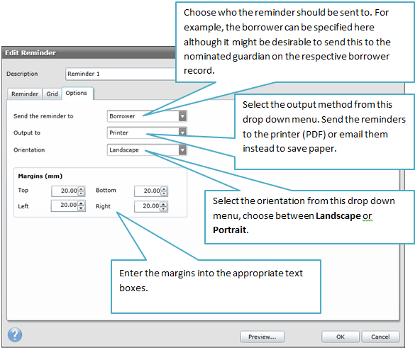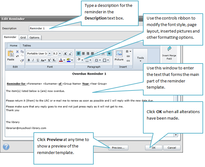 It is advisable to check and edit the reminders as necessary before they are generated. The steps below explain how to modify/check the reminders wording/formatting.