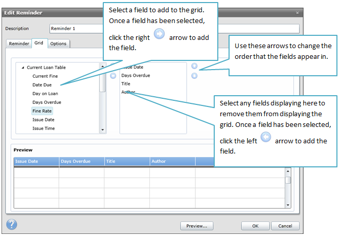 The Grid tab controls the fields that appear in the table of a reminder when it is generated. For more information on editing the grid click here.