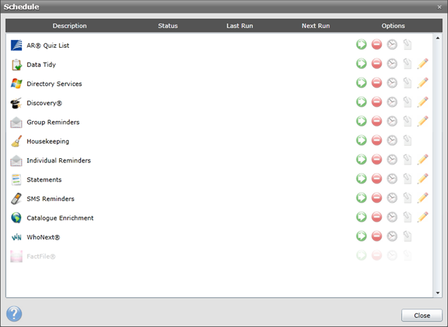 ·Back on the Schedule window, you can click the green arrow to start running the task through immediately but it is advisable to check the settings of the task first to prevent any undesired results, as many tasks have different configurable options. Topics have been created for each task that discuss the configurable options. Click on the links below for details about each one and their respective settings.