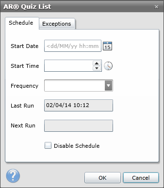 ·To Schedule a task, click on the Clock icon next to the task you wish to change. For instance, clicking on the clock icon next to the AR Quiz List shows the following box.