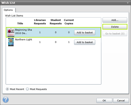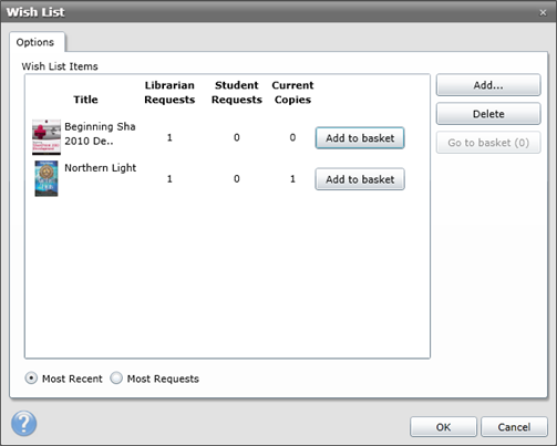 For information about how to add books to the Wish List, see the topic Adding Books to the Wish List. It is also possible to put books from the wish list directly into your Bookshop shopping basket directly, in preparation of ordering them. For more information about this, see the topic Ordering Resource from the Wish List.