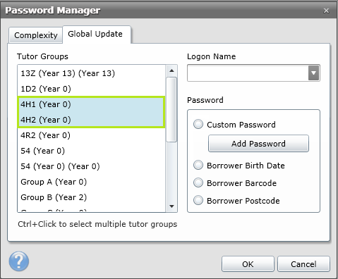 ·Start by selecting the Tutor Groups to update from under the Tutor Groups list. Note that only groups that are selected will be updated. For example, if the group 4H1 is the only group selected/highlighted then only borrowers of 4H1 will have their username/password updated.