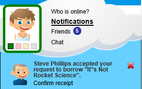 Clicking on Notifications will inform that the request was accepted and shows a Confirm Receipt button so the user can confirm they have received the Home Library item from the friend.