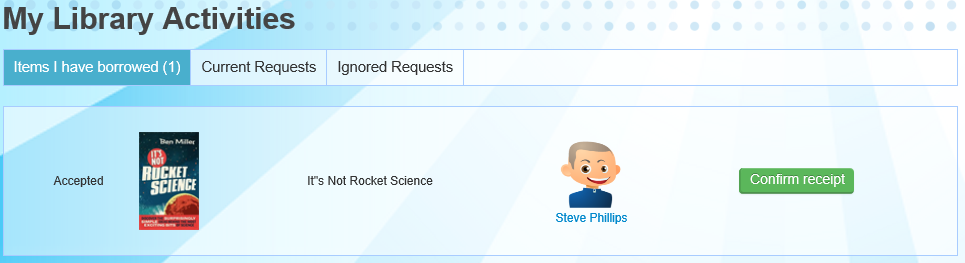 When the borrower receives the item from the friend they can click the Confirm Receipt button.