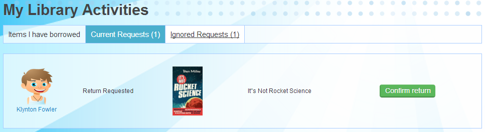 Once the item has been returned the friend can go to My Home Library and Confirm return of the item.
