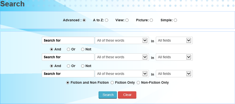 This will open the Advanced Search feature. By default it will have Advanced selected, this will conduct a search based on a set of specific criteria. This feature is modelled on boolean type searching and allows the user to significantly narrow down intended search results.