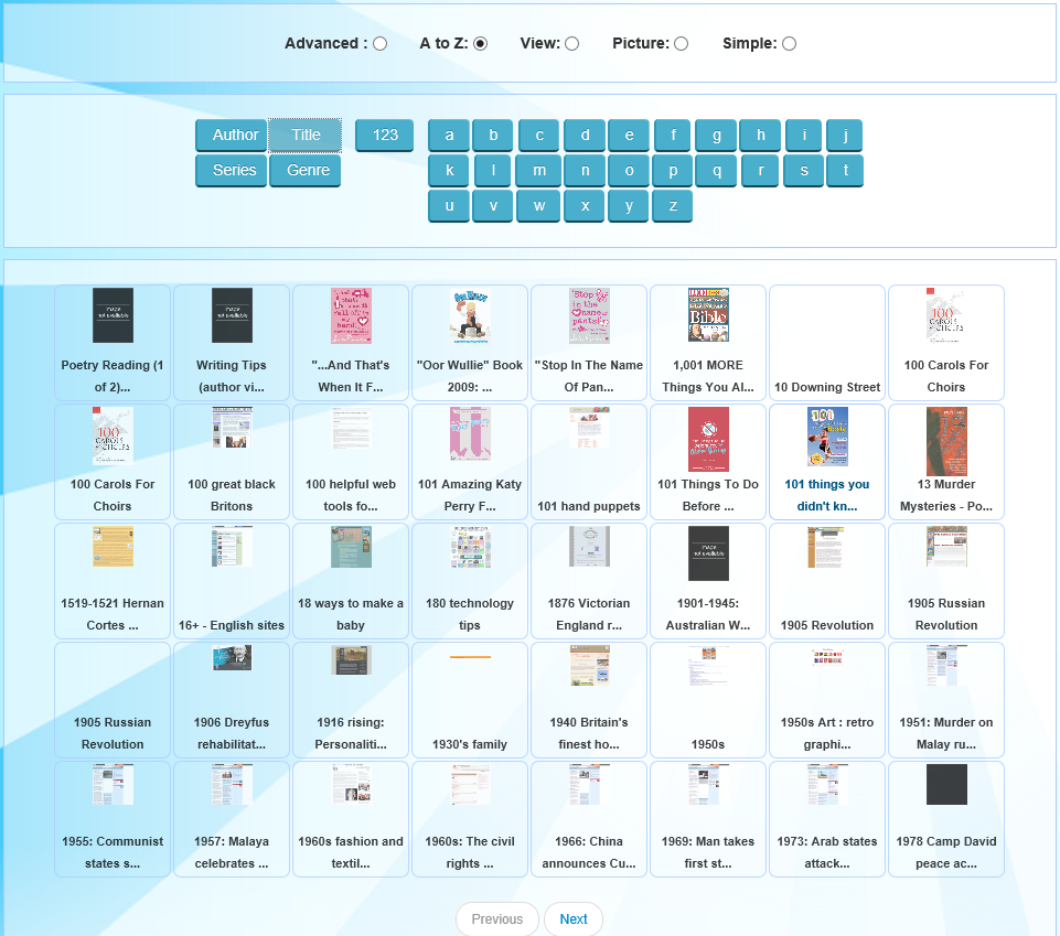 Click A-Z to search for resources in alphabetical order. This search can be further refined by choosing a focus field, such as Title or Author.