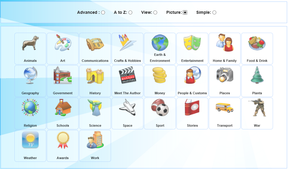 Click Picture to search under the illustrated topics such as Animals, Geography and Sport.