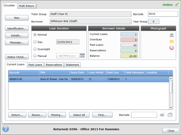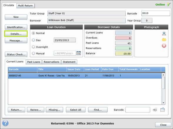 ·Open Circulate and load the borrower record so that the Current Loans / Past loans etc. are visible like in the example image below.